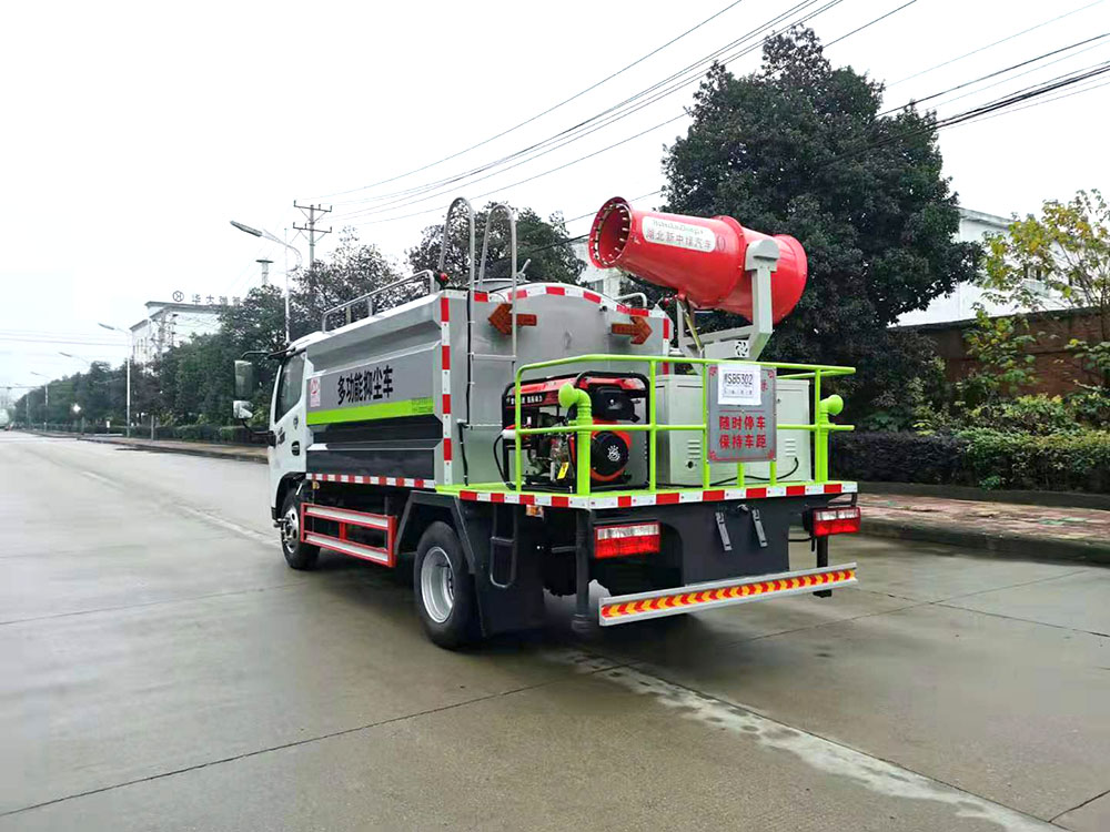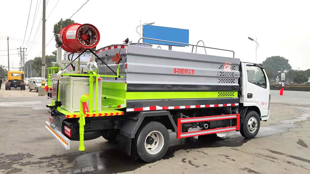 2.抑塵裝置采用國內(nèi)知名品牌,成霧量大、粒徑范圍大。霧炮噴射距離遠(yuǎn),且能實(shí)現(xiàn)俯仰角度可調(diào),滿足不同噴射距離工況的需求。使用副發(fā)動機(jī)驅(qū)動,傳動效率高。操作簡單,各功能通斷控制為電控氣動,一鍵切換,無需手動。